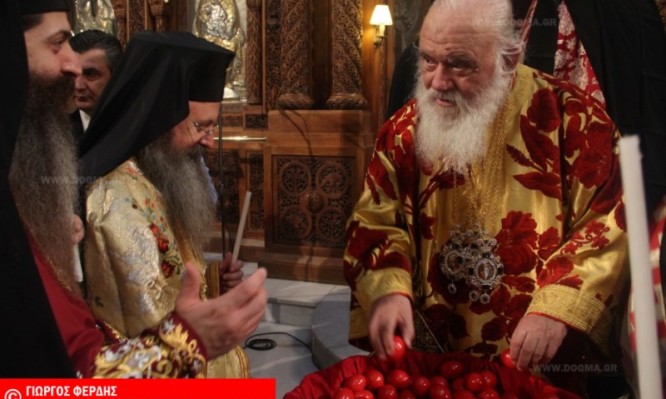 Πριν το τέλος ο κ. Ιερώνυμος ευλόγησε τα κόκκινα πασχαλινά αυγά τα οποία μοίρασε στους πιστούς ευχόμενος Χριστός Ανέστη.