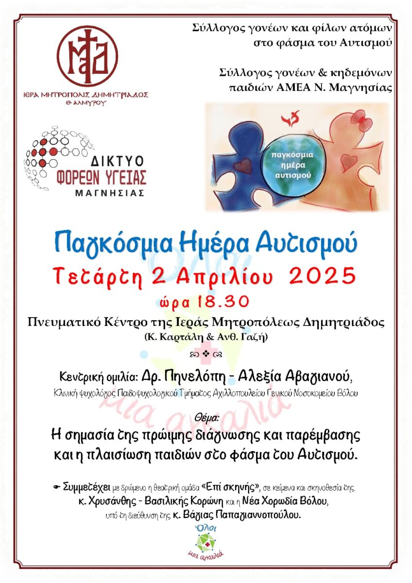 Το Άτυπο Δίκτυο Φορέων Υγείας Μαγνησίας της Ιεράς Μητρόπολης Δημητριάδος & Αλμυρού σε συνεργασία με το Σύλλογο γονέων και φίλων ατόμων στο φάσμα του Αυτισμού και το Σύλλογο γονέων και κηδεμόνων παιδιών ΑΜΕΑ Ν. Μαγνησίας, διοργανώνουν εκδήλωση με αφορμή την Παγκόσμια Ημέρα Αυτισμού, την Τετάρτη 2 Απριλίου και ώρα 18:30 στο Πνευματικό Κέντρο της Ιεράς Μητροπόλεως Δημητριάδος (Κ. Καρτάλη και Ανθ. Γαζή).