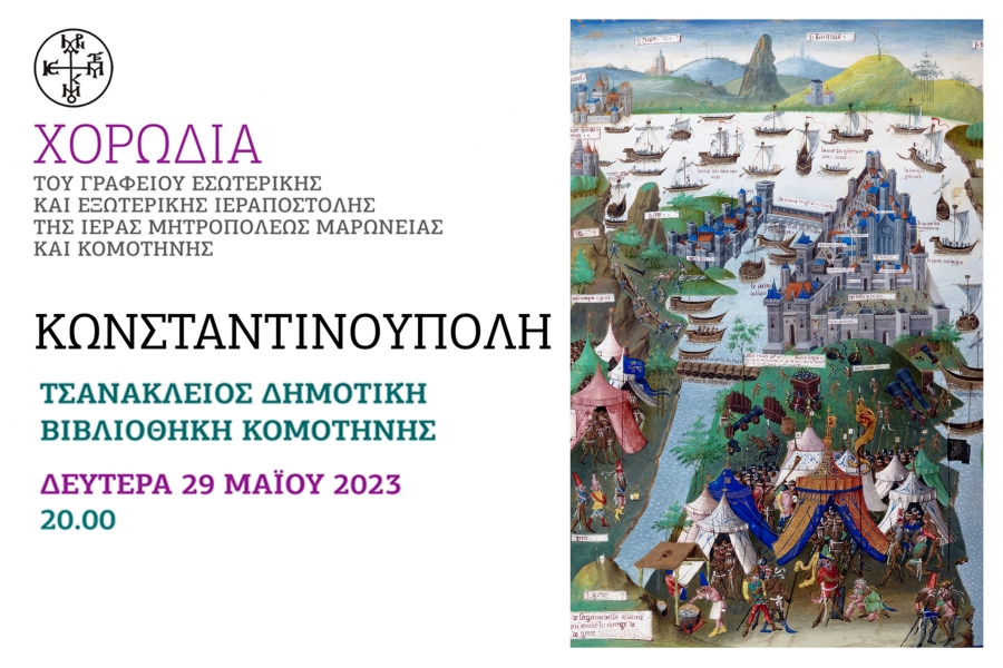 Ἀνακοινώνεται ὅτι ἡ Ἱερά Μητρόπολή Μαρωνείας, μὲ ἀφορμή τὴν ἐπέτειο τῆς Ἁλώσεως τῆς Βασιλευούσης τῶν πόλεων θὰ πραγματοποιήσει τὴν Δευτέρα, 29 Μαΐου 2023 καὶ ὥρα 20:00, στὴν αἴθουσα τοῦ πρώτου ὀρόφου τῆς Τσανακλείου Σχολῆς, Ἐκδήλωση Μνήμης μὲ τίτλο : «ΚΩΝΣΤΑΝΤΙΝΟΥΠΟΛΗ».