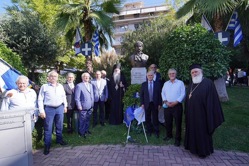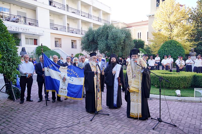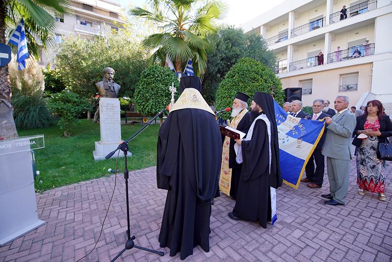 Μετά το τέλος της Θείας Λειτουργίας εψάλη από τον Σεβασμιώτατο, η επιμνημόσυνη δέηση στην προτομή του ήρωα, στον περίβολο του Γηροκομείου Πειραιώς.