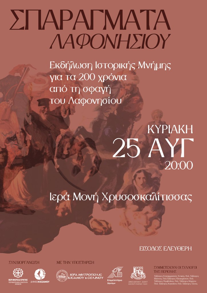 Ο Δήμος Κισάμου και η Περιφέρεια Κρήτης με την υποστήριξη της Ιεράς Μητρόπολης Κισάμου και Σελίνου, του Δήμου Καντάνου και Σελίνου και του Εμπορικού Επιμελητηρίου Χανίων διοργανώνει την Κυριακή 25 Αυγούστου στις 20:00 στην Ιερά Μονή Χρυσοσκαλίτισσας, την δράση «Σπαράγματα Λαφονησίου», εκδήλωση Ιστορικής Μνήμης για τα 200 χρόνια από τη σφαγή του Λαφονησίου.
