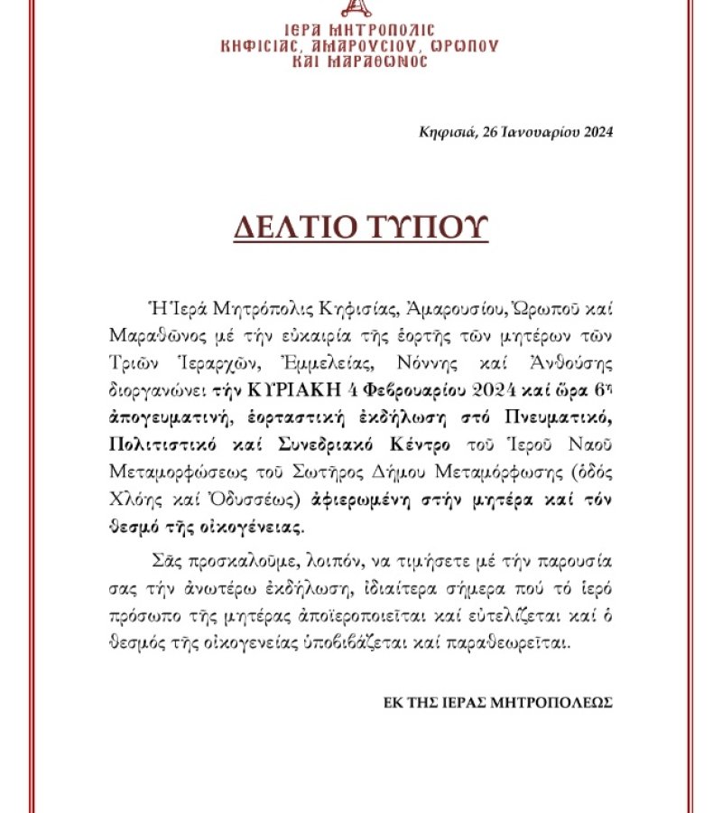 Εκδήλωση στη Μητρόπολη Κηφισίας για τη Μητέρα