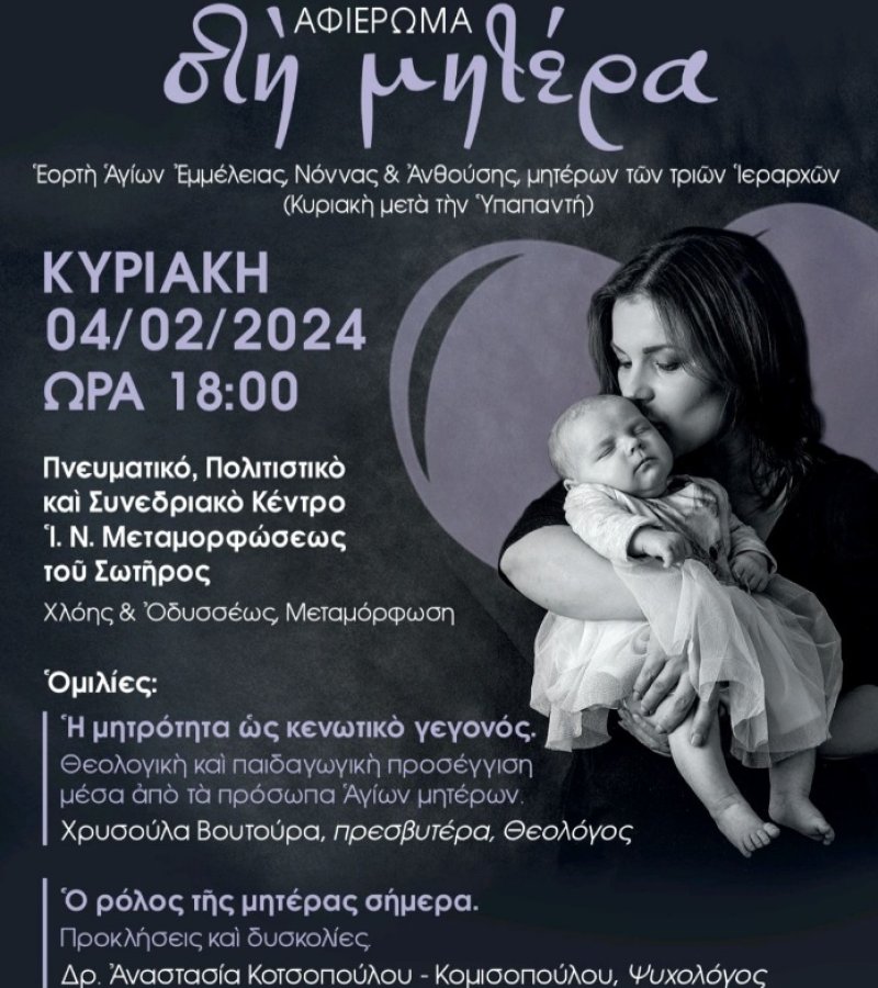 Εκδήλωση στη Μητρόπολη Κηφισίας για τη Μητέρα ΕΛΛΑΔΑ, ΜΗΤΡΟΠΟΛΕΙΣ 29.01.2024 | 17:02 Ο ρόλος της Μητέρας , το θέμα Εκδήλωσης στη Μητρόπολη Κηφισίας