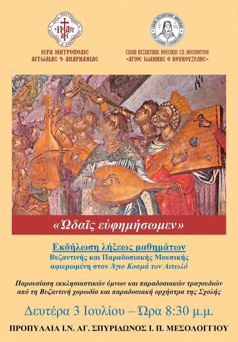 Η Σχολή Βυζαντινής Μουσικής Μεσολογγίου «Άγιος Ιωάννης ο Κουκουζέλης» της Ιεράς Μητροπόλεως Αιτωλίας και Ακαρνανίας, με την ευκαιρία της λήξεως του τρέχοντος σχολικού έτους, θα πραγματοποιήσει Μουσική Εκδήλωση, στον προαύλιο χώρο του Ιερού Μητροπολιτικού Ναού Αγίου Σπυρίδωνος Ιεράς Πόλεως Μεσολογγίου, την Δευτέρα 3 Ιουλίου 2023 και ώρα 20:30’ μ.μ.