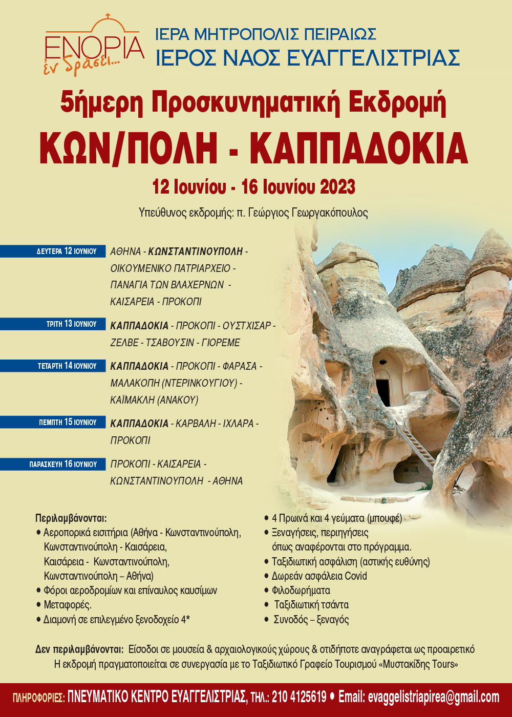 Εκδρομή στην Καππαδοκία διοργανώνει η Ευαγγελίστρια Πειραιώς, σύμφωνα με το κάτωθι Πρόγραμμα:
