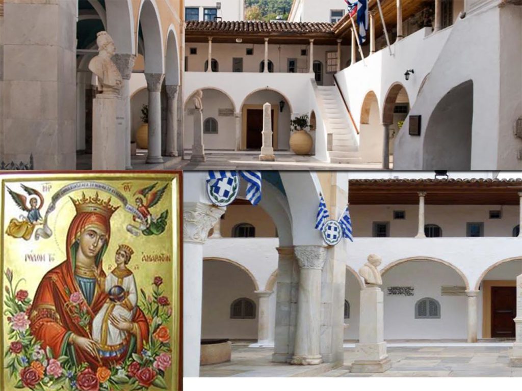 Εξωτερικά της μονής κυριαρχούν δύο μαρμάρινα καμπαναριά και η αυλή της, μια υπαίθρια γλυπτοθήκη, φιλοξενεί τις προτομές του Ανδρέα Μιαούλη, του Λάζαρου Κουντουριώτη, του Γεωργίου Α’ και του Αντωνίου Λιγνού (δημάρχου του νησιού για σειρά ετών), όλα φιλοτεχνημένα από το γλύπτη Δημήτρη Φιλιππότη.