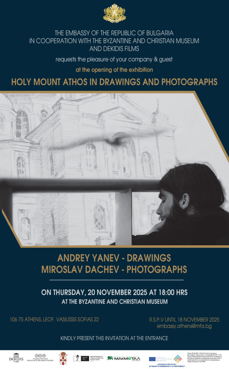 Η μοναδική έκθεση «Το Άγιον Όρος μέσα από σκίτσα και φωτογραφίες» – ένα κοινό έργο του ζωγράφου Andrey Yanev και του καθηγητή Miroslav Dachev, πρύτανη της Εθνικής Ακαδημίας Θεάτρου και Κινηματογράφου της Βουλγαρίας, θα πραγματοποιηθεί από τις 20 Νοεμβρίου έως τις 4 Δεκεμβρίου 2025 στο Βυζαντινό και Χριστιανικό Μουσείο (Λεωφόρος Βασ. Σοφίας 22, Αθήνα 106 75). Θα είναι ανοιχτή από Δευτέρα έως Κυριακή 08:30-15:30, με εξαίρεση την Τρίτη, ημέρα κατά την οποία το μουσείο είναι κλειστό. Η είσοδος είναι ελεύθερη.