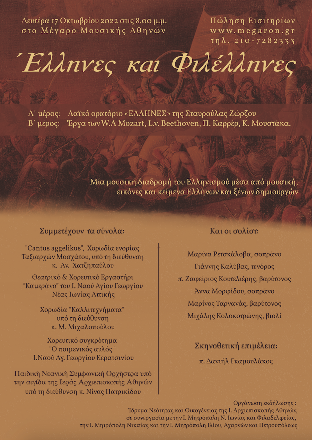 Αφιερωμένη στο ελληνικό πνεύμα που διαχρονικά ενθουσιάζει και εμπνέει όλους τους λαούς με την ομορφιά, τον φιλελευθερισμό και τον ηρωισμό του. Θα ακούσουμε έργα των W.A Mozart, L.v. Beethoven, Π. Καρρέρ, Σ. Ζώρζου, Κ. Μουστάκα.