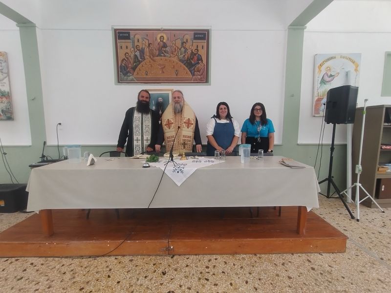 Ο Σεβασμιώτατος τέλεσε τον αγιασμό και ευχαρίστησε τόσο τον π. Παναγιώτη Ζαβλανό, ο οποίος θα είναι ο πνευματικός καθοδηγητής της παρούσας περιόδου, όσο και την Αρχηγό της Κατασκήνωσης, Πρεσβυτέρα Αθηνά Τσιούκα Ζαβλανού, την Υπαρχηγό Δέσποινα Πλαστάρα, τον νοσηλευτή κ. Βασίλη, τις ομαδάρχισσες, τους Πατέρες και τις κυρίες που διακονούν στο μαγειρείο.