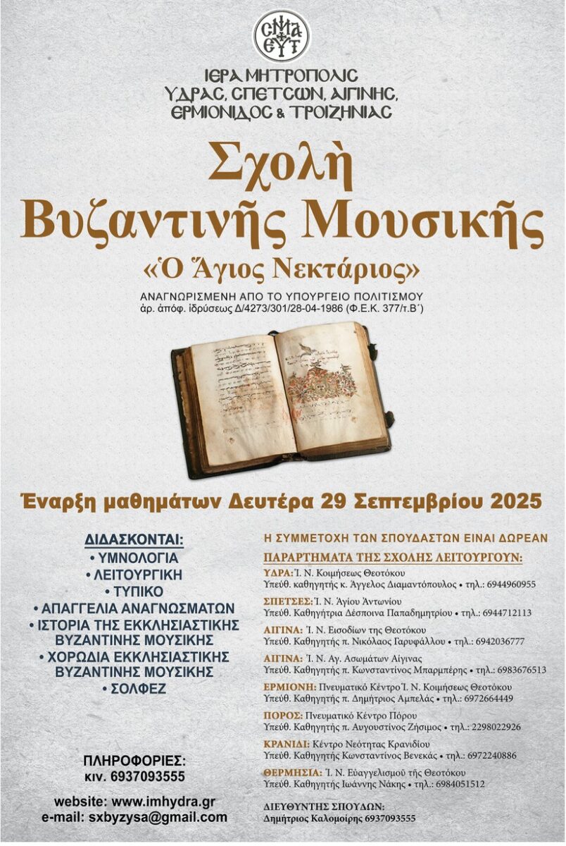 Η Ιερά Μητρόπολη Ύδρας, Σπετσών, Αιγίνης, Ερμιονίδος & Τροιζηνίας ανακοινώνει την έναρξη των μαθημάτων της Σχολής Βυζαντινής Μουσικής «Ο Άγιος Νεκτάριος» τη Δευτέρα 29 Σεπτεμβρίου 2025. Η συμμετοχή είναι δωρεάν και τα παραρτήματα λειτουργούν σε Ύδρα, Σπέτσες, Αίγινα, Ερμιόνη, Πόρο, Κρανίδι και Θερμησία.