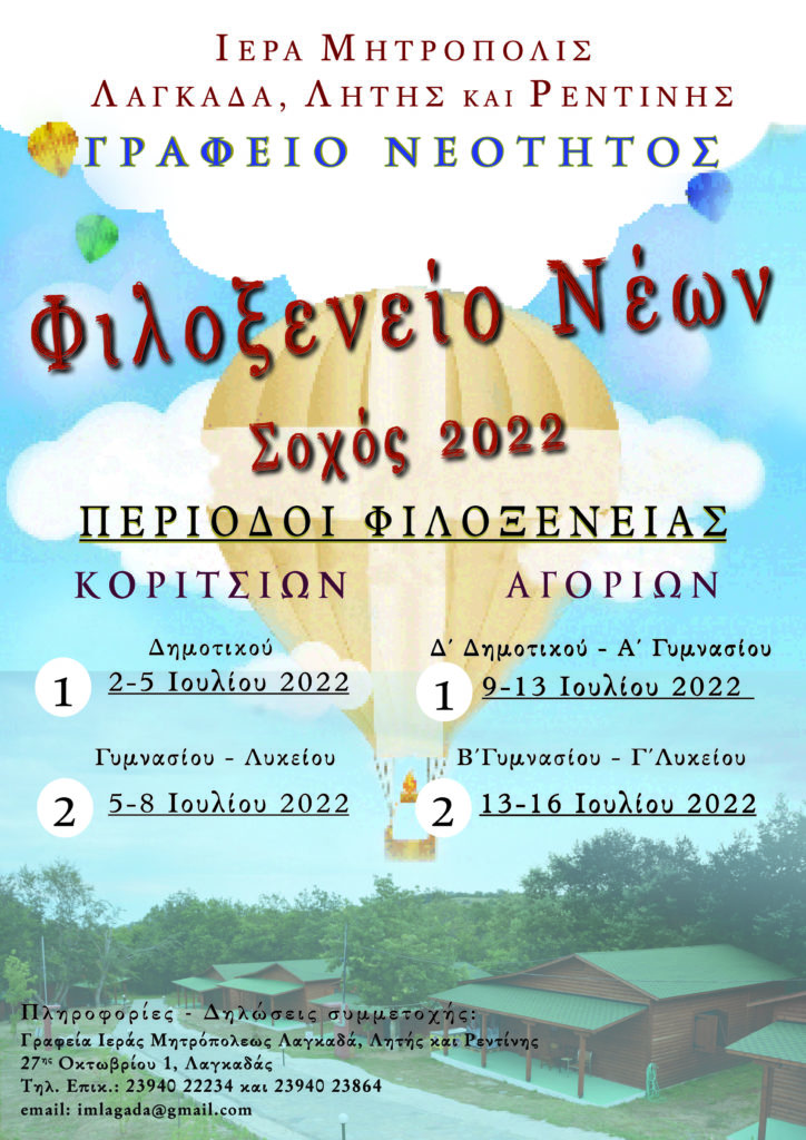 Με τη χάρη του Θεού και σεπτή ευλογία του Σεβασμιωτάτου Μητροπολίτου Λαγκαδά, Λητής και Ρεντίνης κ. Πλάτωνος, το εφετινό καλοκαίρι θα λειτουργήσει το Θερινό Πρόγραμμα Φιλοξενίας Νέων στις εγκαταστάσεις της Μητροπόλεως στην περιοχή του Σοχού.