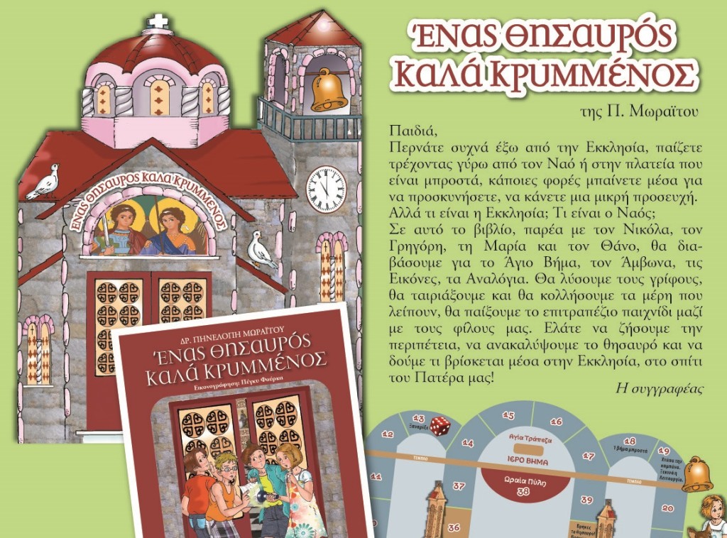 Κρατώ μέ πολλή χαρά στα χέρια μου το όμορφο αυτό βιβλίο με τον τίτλο «Ένας θησαυρός καλά κρυμμένος, Μαθαίνω για τα μέρη του Ναού», αυτό πού και σεις διαβάζετε αυτή τη στιγμή. Διαβάζω γιά τό Άγιο Βήμα, τό Ιερότερο σημείο τού Ναού, διαβάζω γιά τόν Άμβωνα, γιά τόν Αρχιερατικό Θρόνο, γιά τις Είκονες, γιά τά Αναλόγια, γιά όλα αυτά πού μάς αποκαλύπτει μέσα από την αφήγηση μιας περιπέτειας, γραμμένης από την κα Πηνελόπη Μωραΐτου και εικονογραφημενης από την κα Πέγκυ Φούρκα..