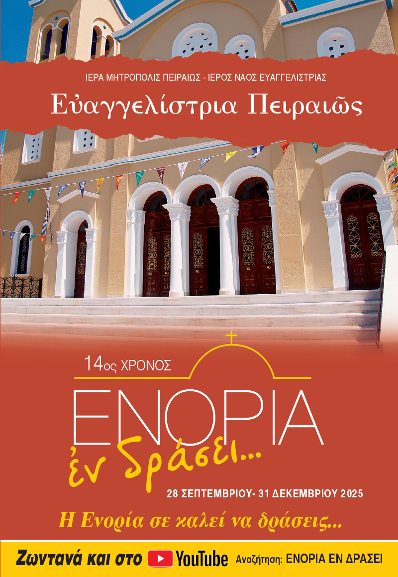 Με την χάρη του Θεού, εισερχόμεθα στον 14ο χρόνο του προγράμματος καθημερινών δραστηριοτήτων και εκδηλώσεων της Ενορίας Ευαγγελιστρίας Πειραιώς, με τον τίτλο «ΕΝΟΡΙΑ εν δράσει», που διαρκεί κάθε χρόνο από τον Οκτώβριο έως και τον Δεκέμβριο.