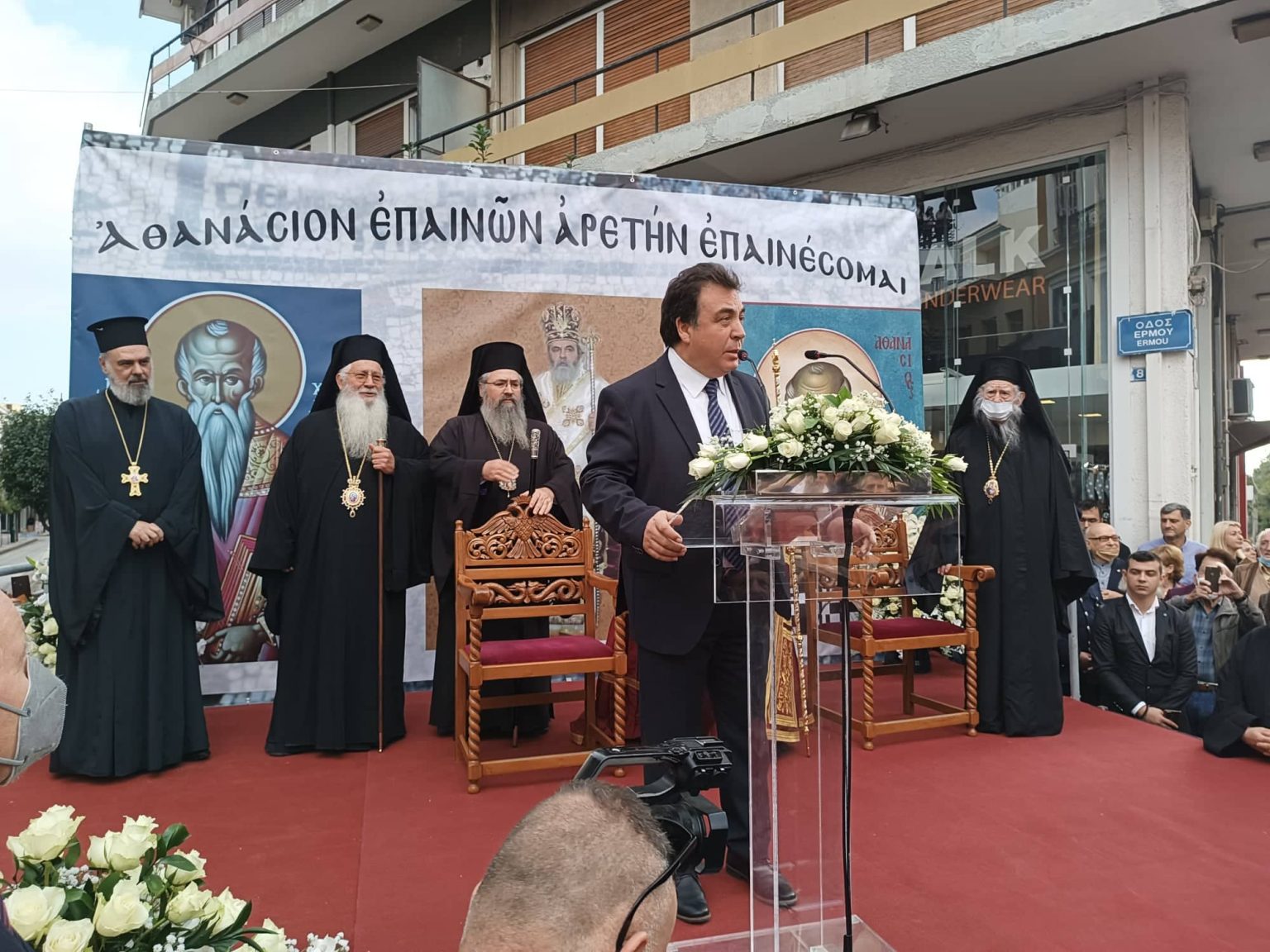 Στο χαιρετισμό του ο Δήμαρχος Πύργου αναφέρθηκε αρχικά στον τοποτηρητή της Ι.Μ. Ηλείας και πρώην Μητροπολίτη Ηλείας κ.κ. Γερμανό, λέγοντας: «Είναι τιμή μας, σαν λαός της Ηλείας που τόσα χρόνια σας είχαμε πνευματικό μας ηγέτη. Πάντα θα σας έχουμε στην καρδιά μας και στο μυαλό μας γιατί παραμείνατε στο κοινό ως παράδειγμα προσφοράς της Εκκλησίας και της διοίκησης» και συνέχισε: