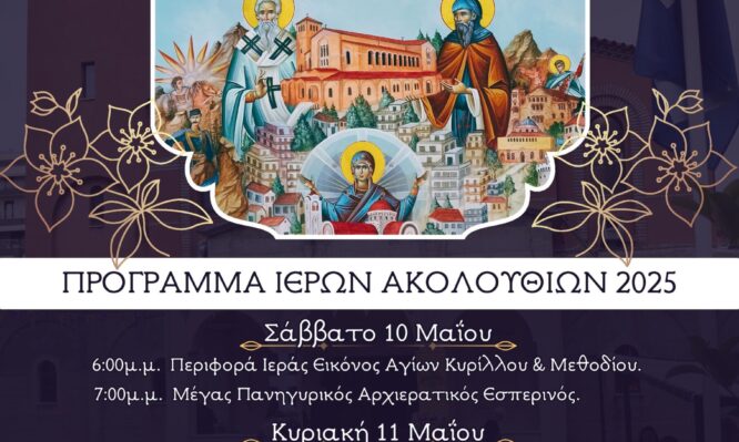 Όπως κάθε χρόνο έτσι και φέτος θα τιμηθεί με κάθε εκκλησιαστική λαμπρότητα, κατάνυξη και ευλάβεια, η μνήμη των Αγίων Ισαποστόλων Κυρίλλου & Μεθοδίου των Θεσσαλονικέων φωτιστών των Σλάβων, στον ομώνυμο Ιερό Ναό, στη Νέα Πολιτεία Ευόσμου.