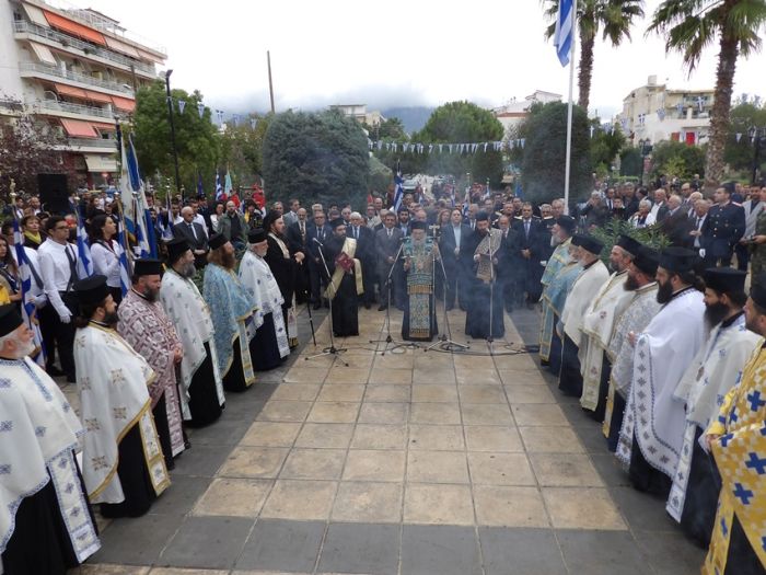 Ακολούθως, ο Σεβασμιώτατος Μητροπολίτης προέστη στην Δοξολογία, στην οποία παρέστησαν οι Πολιτικές και Στρατιωτικές Αρχές του Τόπου, ενώ την Πολιτεία εκπροσώπησε ο Γ. Γραμματέας Λιμένων κ. Χρήστος Λαμπρίδης, καθώς και πλήθος πιστών. Εν συνεχεία και μετά το επιμνημόσυνο Τρισάγιο στο Ηρώον, στον περίβολο του Καθεδρικού Ι. Ναού του Απ. Παύλου, παρακολούθησε την παρέλαση αισθανόμενος αγαλλίαση για τα νιάτα του Τόπου μας, τα οποία είναι και τα μόνα που μπορούν να μας οδηγήσουν εκτός του αδιεξόδου, στο οποίο έχουμε περιέλθει.
