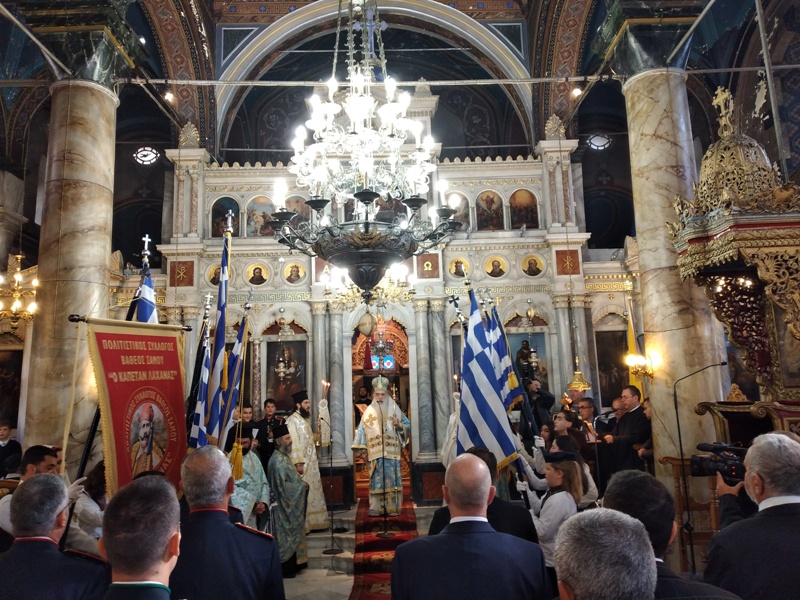 Ὁ κ. Εὐσέβιος, χοροστάτησε στόν Ὄρθρο, τέλεσε τήν Θεία Λειτουργία καί τήν ἐπίσημη Δοξολογία στόν Ἱερό Μητροπολιτικό Ναό τοῦ Ἁγίου Νικολάου Βαθέος, στή συνέχεια τέλεσε Ἐπιμνημόσυνη δέηση ἐνώπιον τοῦ Ἀνδριάντος τοῦ Θεμιστοκλῆ Σοφούλη καί ἀπό τῆς ἐξέδρας παρηκολούθησε τήν μαθητική καί στρατιωτική παρέλαση.