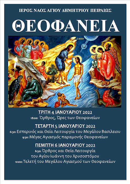 Ο Ιερός Ναός Αγίου Δημητρίου Πειραιώς εξέδωσε Ανακοίνωση με την οποία ενημερώνει τους πιστούς για το Πρόγραμμα των Ι. Ακολουθιών το τριήμερο 4, 5 και 6 Ιανουαρίου 2022: