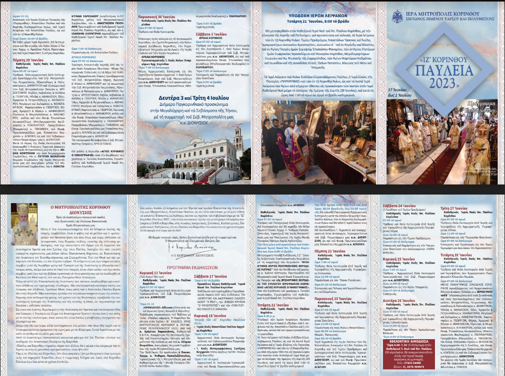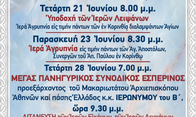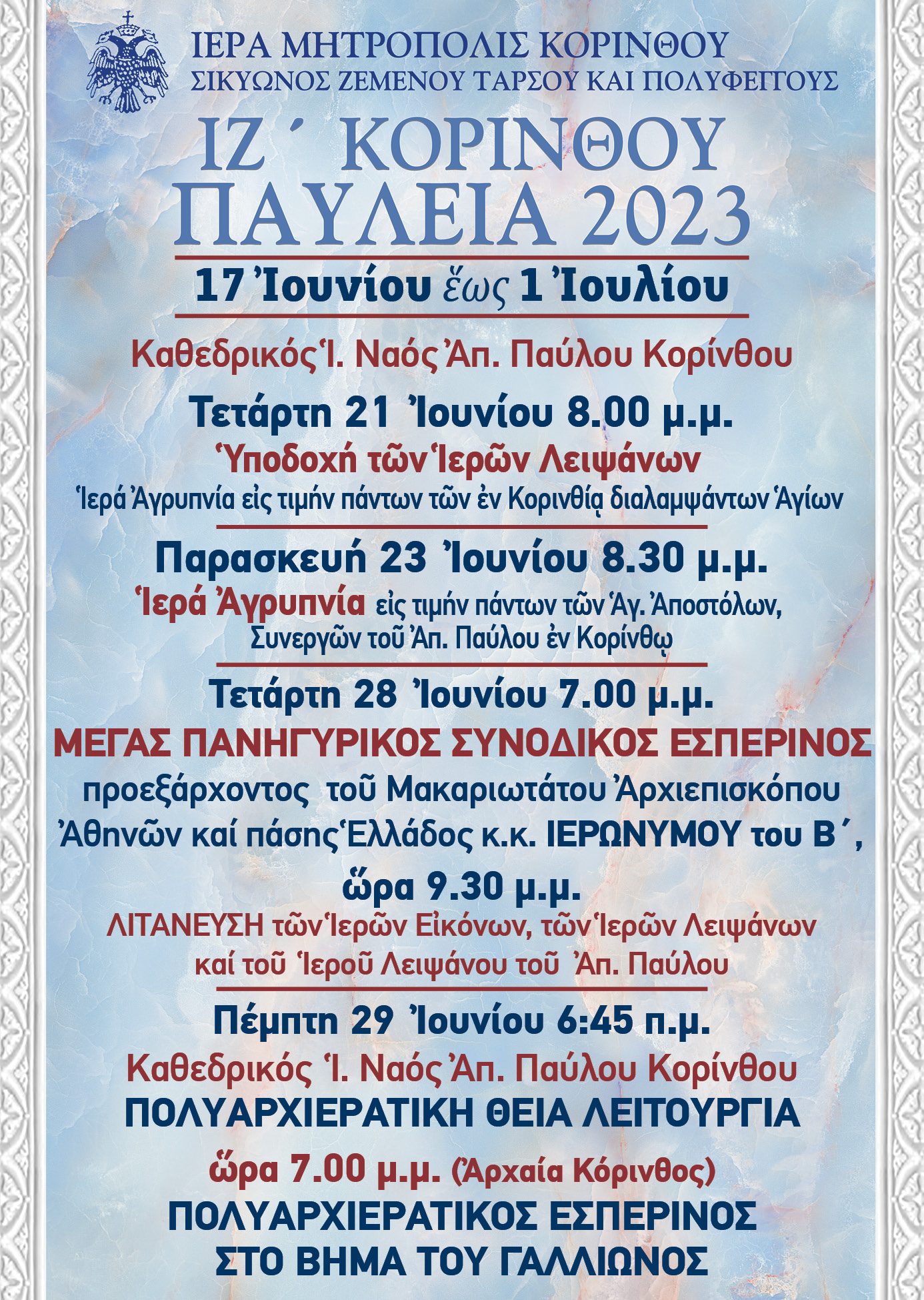 Με λαμπρότητα θα πραγματοποιηθούν οι Εορταστικές Εκδηλώσεις ΙΖ΄ ΠΑΥΛΕΙΑ 2023, στη Μητρόπολη Κορίνθου, σύμφωνα με το κάτωθι Πρόγραμμα:
