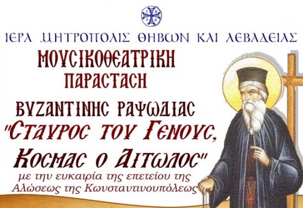 Μουσικοθεατρική παράσταση Βυζαντινής Ραψωδίας με το όνομα «Κοσμάς ο Αιτωλός» διοργανώνει η Ιερά Μητρόπολη Θηβών και Λεβαδείας την Κυριακή 2 Ιουνίου, στο πλαίσιο των εορταστικών εκδηλώσεων της επετείου της Άλωσης της Κωνσταντινούπολης.
