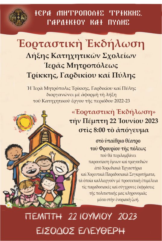 Η Ιερά Μητρόπολη Τρίκκης, Γαρδικίου και Πύλης διοργανώνει με αφορμή τη λήξη του Κατηχητικού έργου της περιόδου 2022-23 «Εορταστική Εκδήλωση» η οποία θα πραγματοποιηθεί την Πέμπτη 22 Ιουνίου 2023 στις 8 το απόγευμα στο Υπαίθριο Θέατρο του Φρουρίου της πόλεως.