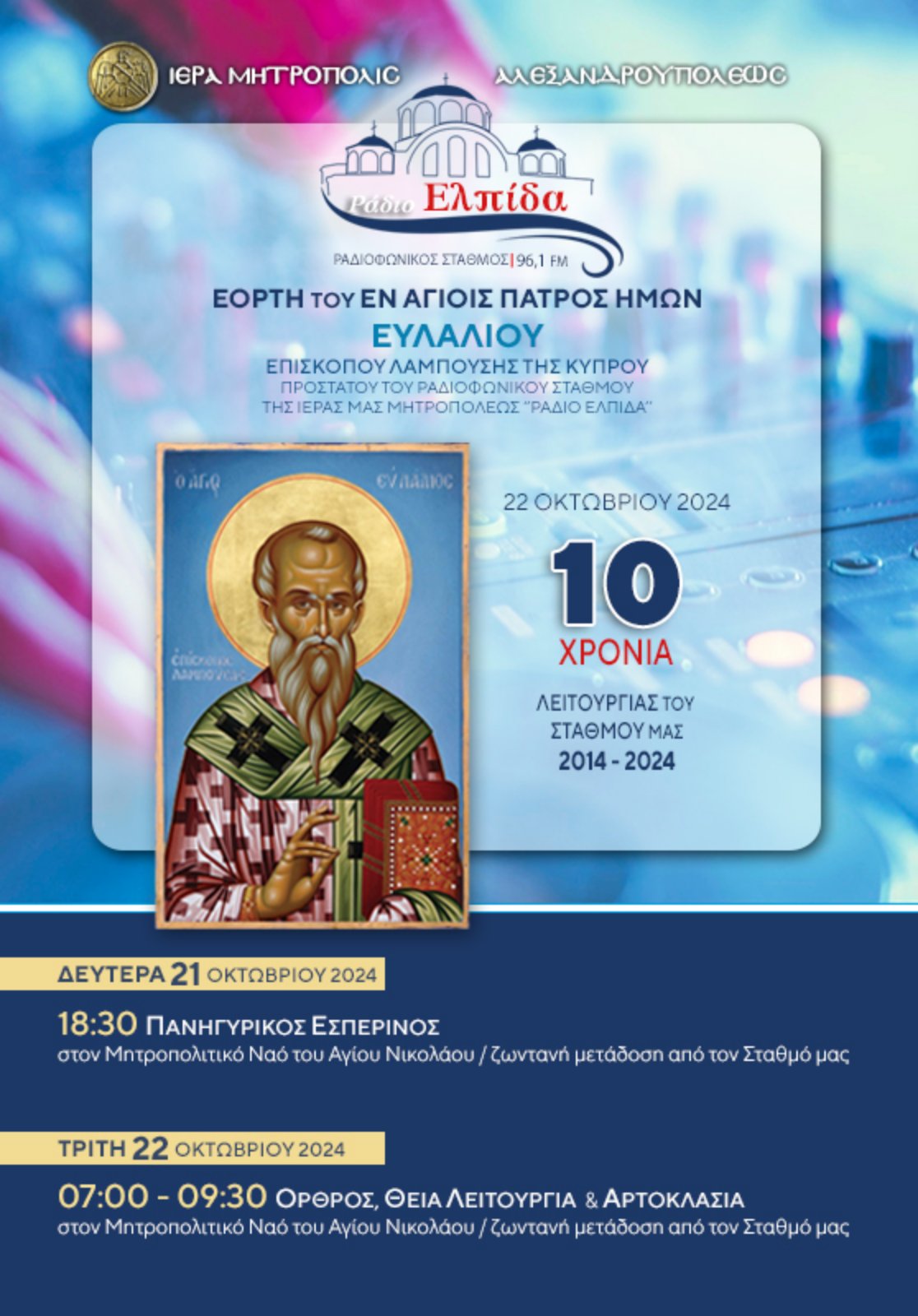 Εορτή Αγίου Ευλαλίου, προστάτου του Ραδιοφωνικού Σταθμού “ΡΑΔΙΟ ΕΛΠΙΔΑ 96,1” ΕΛΛΑΔΑ, ΜΗΤΡΟΠΟΛΕΙΣ 18.10.2024 | 20:17