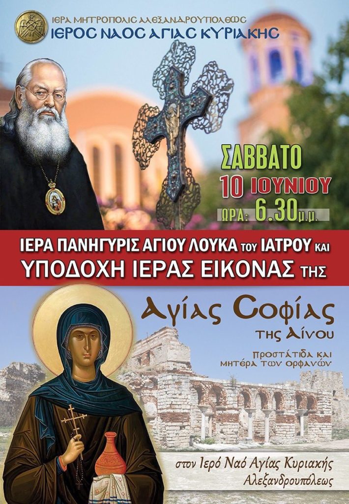 Την προσεχή Κυριακή 11 Ιουνίου 2023 η Εκκλησία μας εορτάζει την μνήμη του Αγίου Λουκά του ιατρού, αρχιεπισκόπου Συμφερουπόλεως της Κριμαίας, και στην Αλεξανδρούπολη πανηγυρίζει η ενορία της Αγίας Κυριακής, όπου υπάρχει στον προαύλιο χώρο παρεκκλήσιο του Αγίου και φυλάσσεται τεμάχιο εκ του ιερού του λειψάνου.