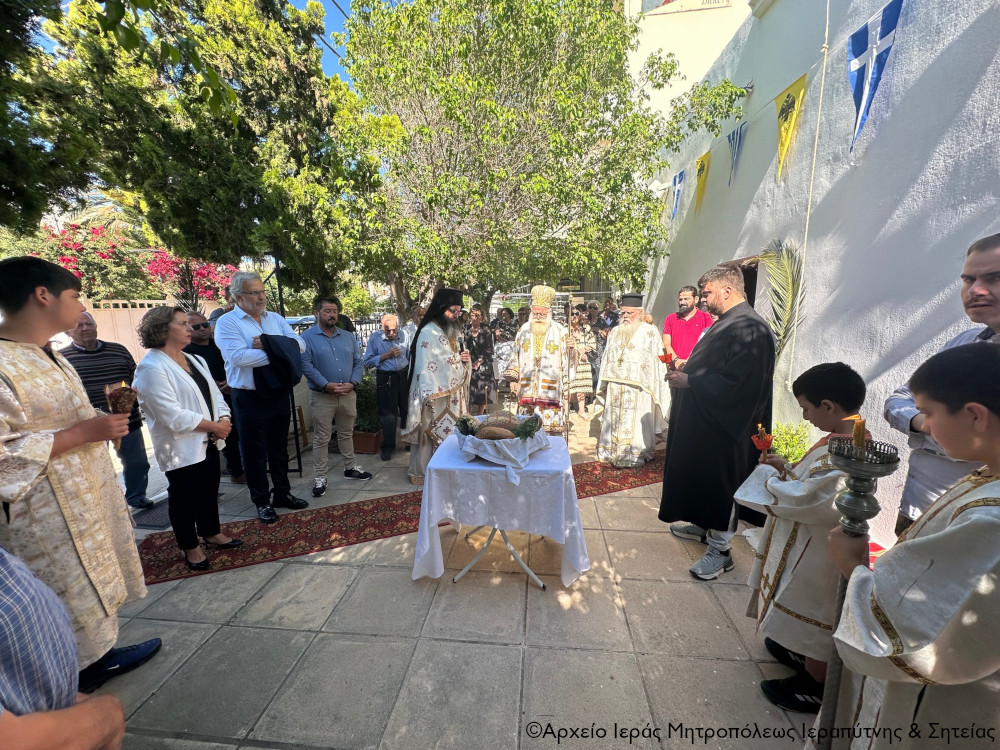 Στην Αρχιερατική θεία Λειτουργία έλαβαν μέρος ο Πανοσιολ. Αρχιμ. Αμβρόσιος Σκαρβέλης, Πρωτοσύγκελλος της Ι. Μητροπόλεως και Ηγούμενος της Ιεράς Μονής Τοπλού, ο Αιδεσιμολ. Εφημέριος της Ενορίας πρωτ. Γεώργιος Χατζάκης και ο Διάκονος Θεμιστοκλής Μπεϊνάς.