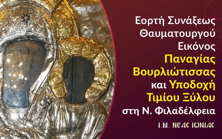 Η Ιερά Μητρόπολη Νέας Ιωνίας, Φιλαδελφείας, Ηρακλείου και Χαλκηδόνος ανακοινώνει ότι την Κυριακή 5 Οκτωβρίου 2025 εορτάζεται πανηγυρικά η Σύναξη της Ιεράς θαυματουργού Εικόνος της Παναγίας της Βουρλιώτισσας, Πολιούχου της πόλεως της Νέας Φιλαδέλφειας, την οποία οι πρόσφυγες πρόγονοί μας μετέφεραν από τα Βουρλά της Μικράς Ασίας και την εναπέθεσαν στον Ιερό Καθεδρικό Ναό Κοιμήσεως της Θεοτόκου Νέας Φιλαδελφείας.