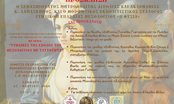 Το Σάββατο 7 Μαρτίου 2026 και ώρα 7 μ.μ το απόγευμα, στην αίθουσα εκδηλώσεων της Περιφερειακής Ενότητος Αιτωλοακαρνανίας στην Ιερά Πόλη Μεσολογγίου, ο Σύλλογος Γυναικών Μεσολογγίου «Θυσία», σε συνεργασία με το Λύκειο Ελληνίδων Βόλου, διοργανώνει εκδήλωση αφιερωμένη στις ηρωίδες Εξοδίτισσες, με κεντρικό θέμα «Γυναίκες της Εξόδου με ταυτότητα».