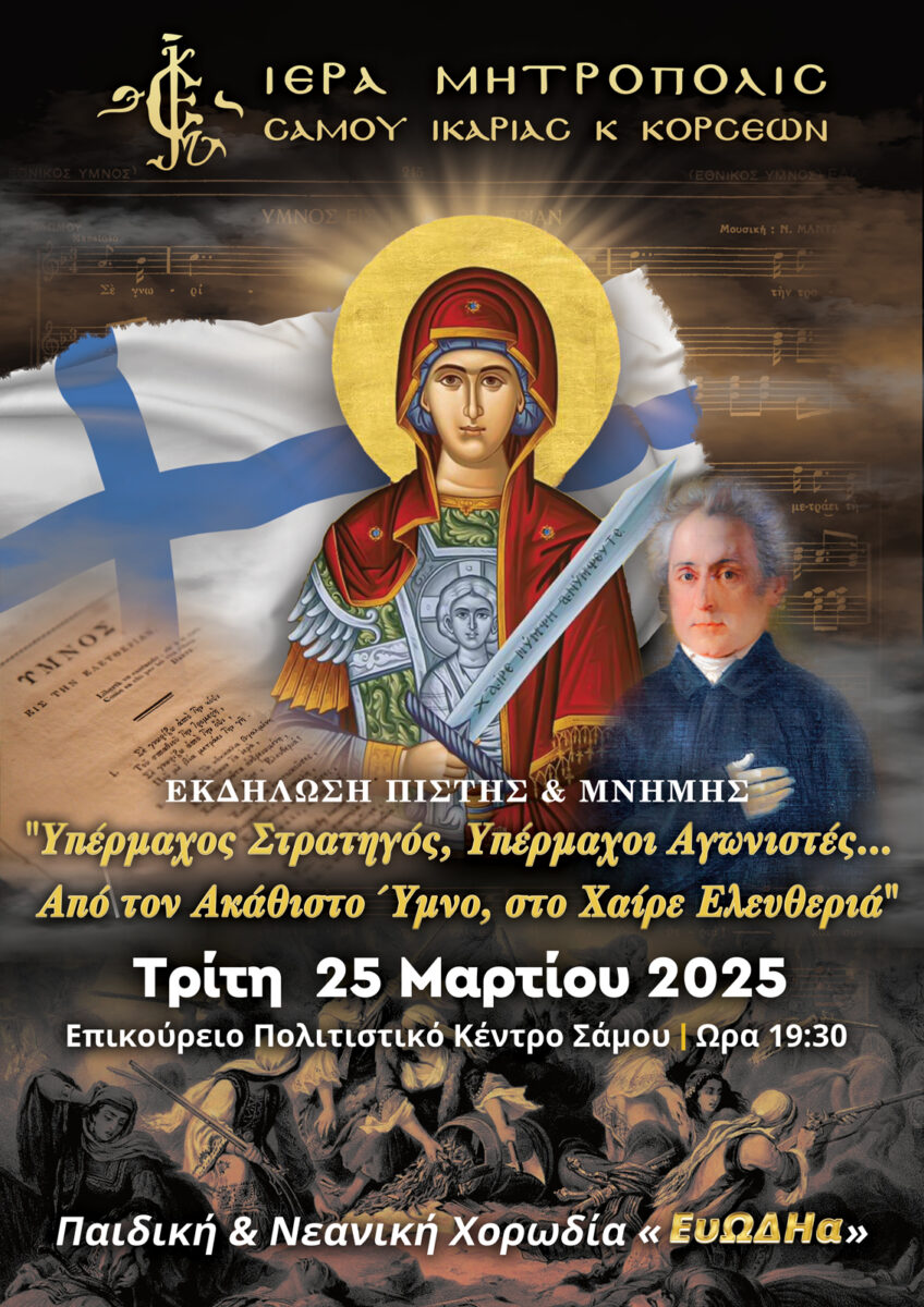 Μια ξεχωριστή εκδήλωση αφιερωμένη στην Παναγία και τον Εθνικό μας Ύμνο, με τίτλο: «Υπέρμαχος Στρατηγός, Υπέρμαχοι Αγωνιστές» – Από τον Ακάθιστο Ύμνο, στο «Χαίρε, Ελευθεριά», θα παρουσιάσει η Ι. Μητρόπολη Σάμου και Ικαρίας, στο πλαίσιο του εορτασμού της Εθνικής Επετείου της Ελληνικής Επανάστασης του 1821. Εκδήλωση πίστης και μνήμης, αφιερωμένη στη Μεγάλη Μάνα και στους γενναίους υπερασπιστές της Πατρίδος.