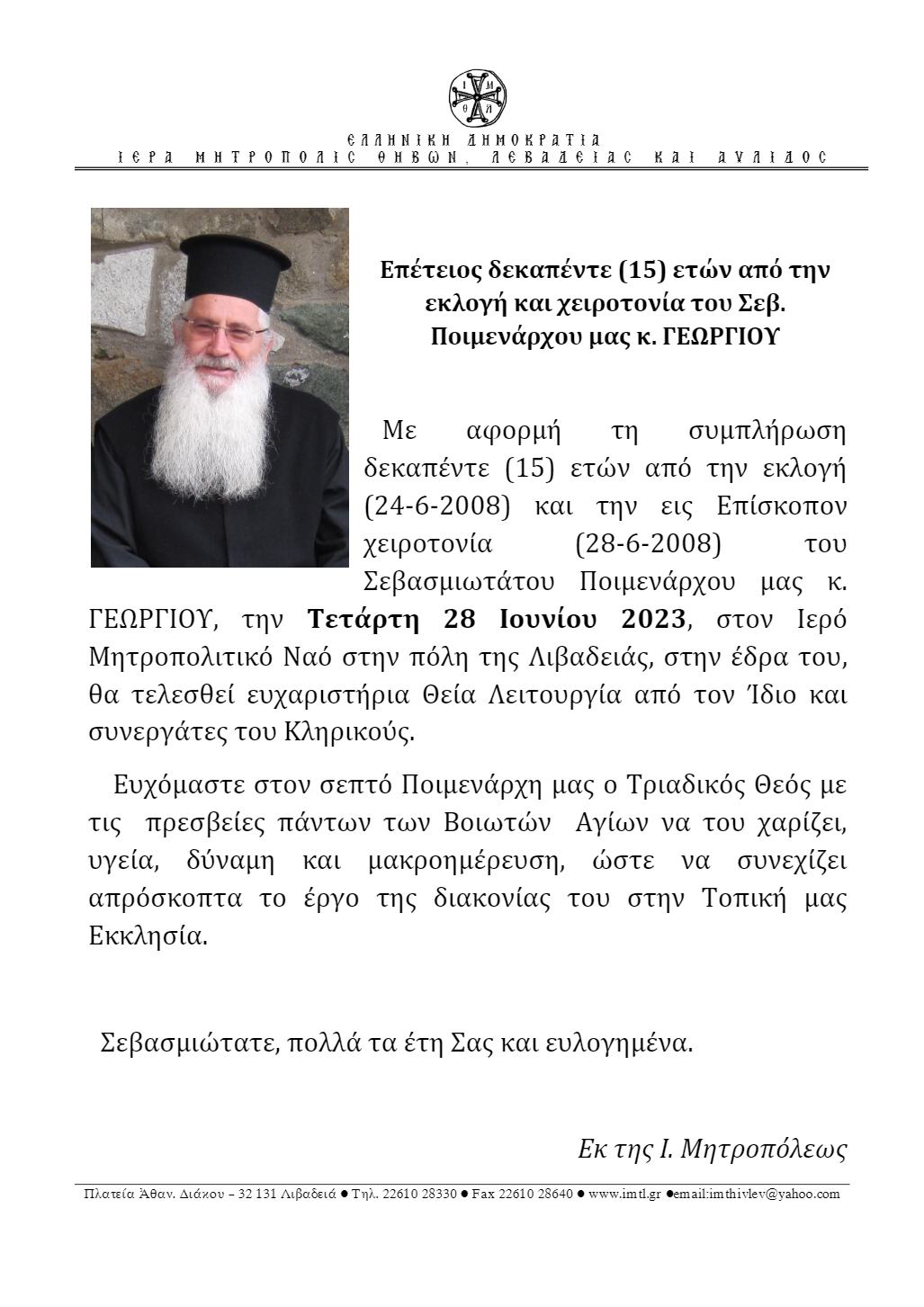 Η Μητρόπολη Θηβών, με αφορμή τη συμπλήρωση 15 ετών από την εκλογή και χειροτονία του Μητροπολίτου Θηβών κ. Γεωργίου, εξέδωσε την ακόλουθη Ανακοίνωση: