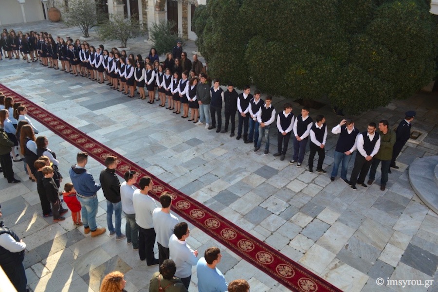 Στον αύλειο χώρο του Ιερού Ιδρύματος παρατεταγμένοι, εκπαιδευτικοί μαθήτριες και μαθητές όλων των βαθμίδων προσέδωσαν ιδιαίτερη τιμή και λαμπρότητα.