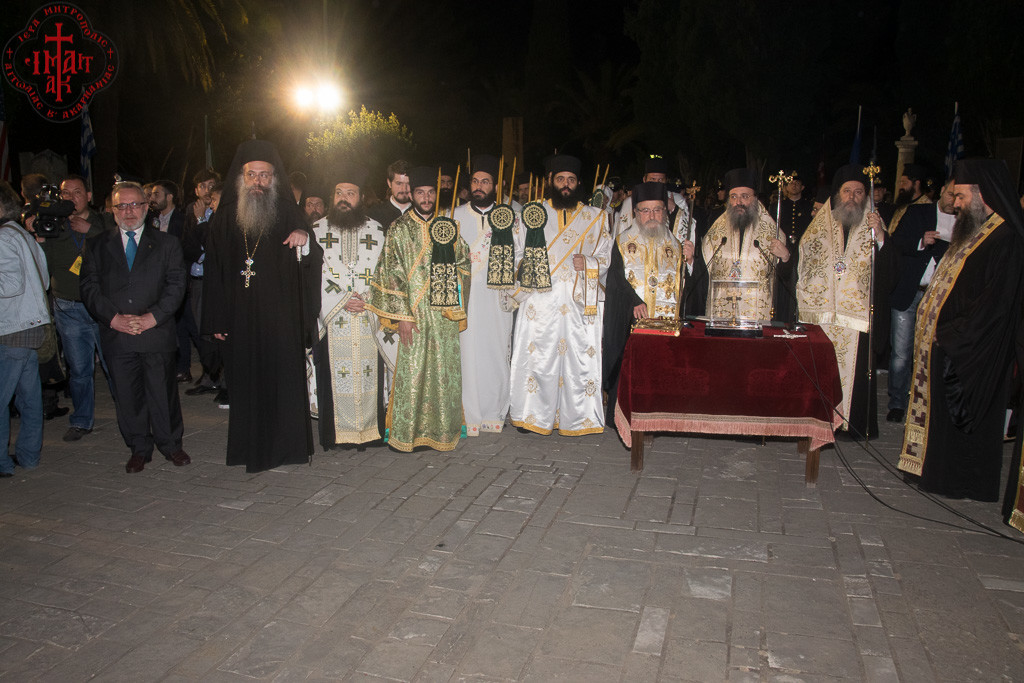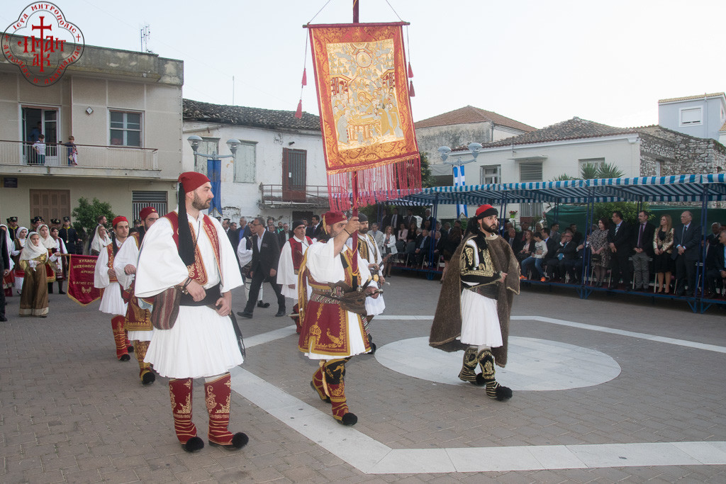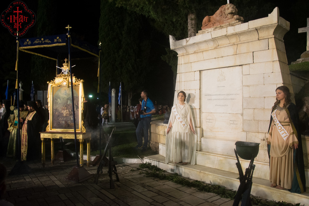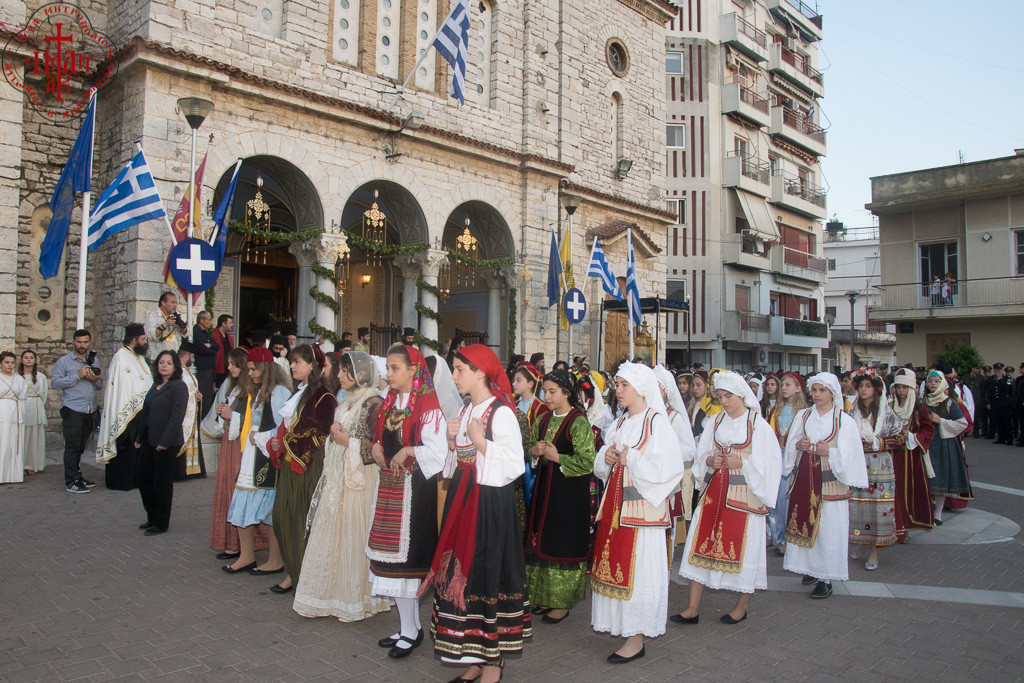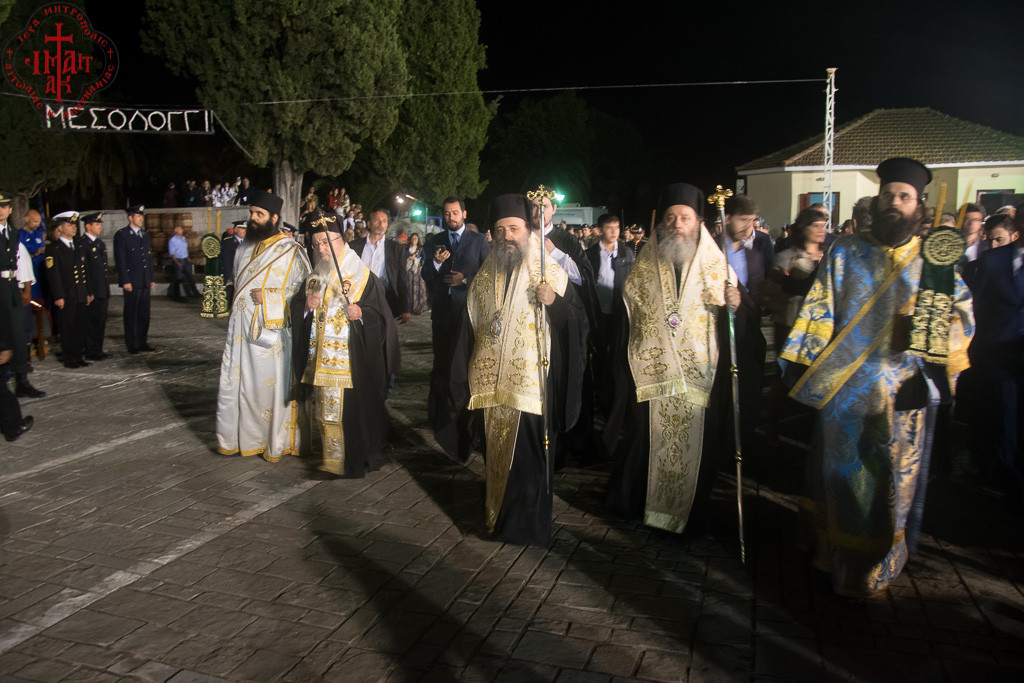 Του Εσπερινού, ακολούθησε η λιτανευτική πομπή, με επικεφαλής την Εικόνα της Εξόδου και τον Σταυρό ευλογίας του Επισκόπου Ρωγών Ιωσήφ, από τον Ιερό Ναό στον Κήπο των Ηρώων. Στην ιερά λιτανεία συμμετείχαν οι Σεβασμιώτατοι Αρχιερείς, ο ιερός κλήρος και οι αρχές του τόπου, ενώ προηγήθηκαν μαθητικές αντιπροσωπίες των Σχολείων της Ιεράς Πόλεως, μέλη πολιτιστικών συλλόγων του Νομού Αιτωλοακαρνανίας και άλλων Νομών, φιλαρμονικές και τιμητικά αγήματα των τριών Σωμάτων του Ελληνικού μας Στρατού.