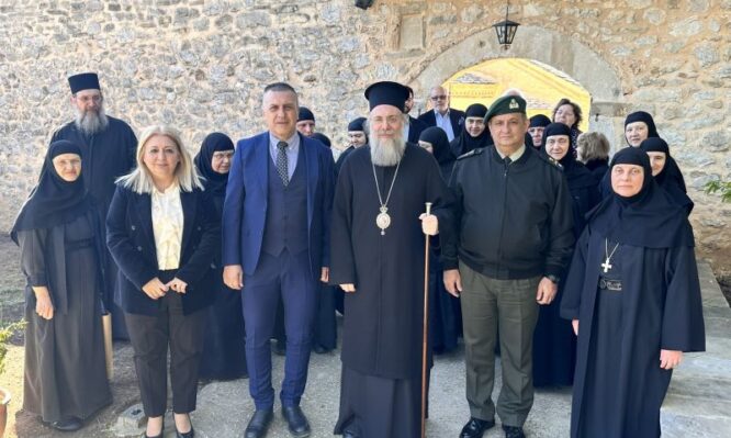 Κατά τη διάρκεια της επίσκεψης, οι προσκεκλημένοι είχαν την ευκαιρία να συνομιλήσουν με τον Σεβασμιώτατο και τη μοναστική αδελφότητα, ανταλλάσσοντας ευχές και συζητώντας διάφορα θέματα κοινού ενδιαφέροντος.