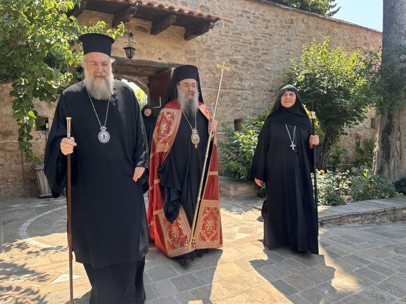 Τον Σεβασμιώτατο Πατρών υποδέχθηκε στα προπύλαια της Μονής η Ηγουμένη Θεοφύλακτη μοναχή με όλη την αδελφότητα, παρουσία του Σεβασμιωτάτου Μητροπολίτου Τρίκκης, Γαρδικίου και Πύλης κ. Χρυσοστόμου.