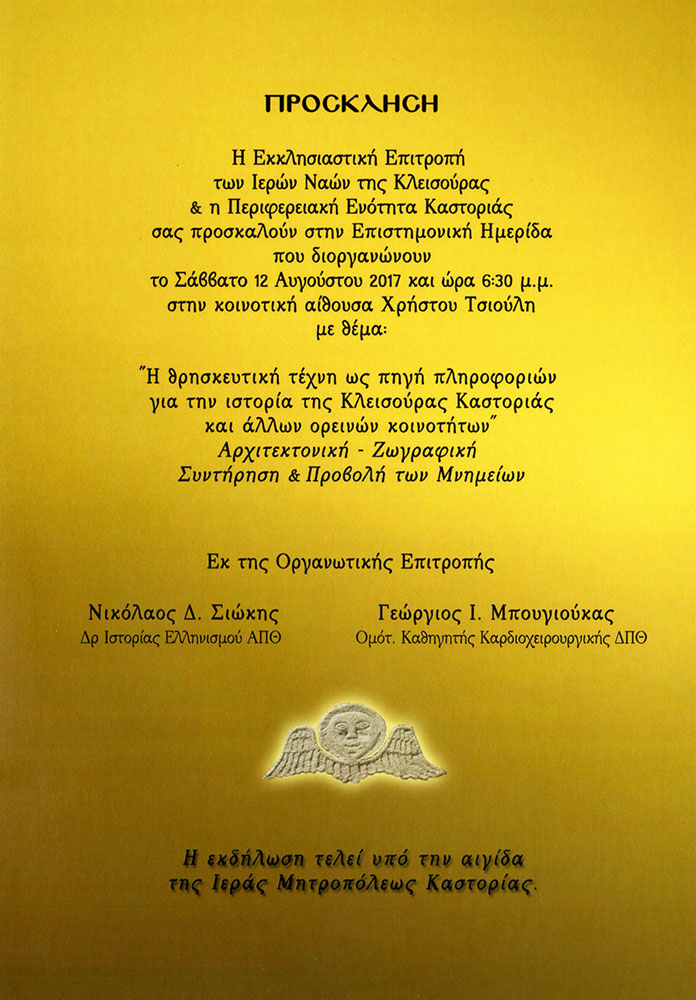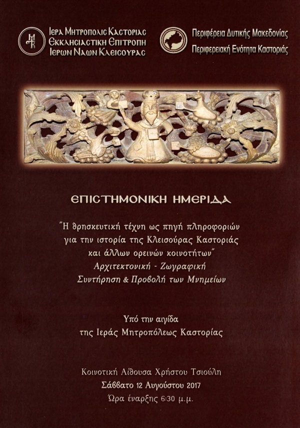 Επιστημονική ημερίδα διοργανώνει η Εκκλησιαστική Επιτροπή των Ιερών Ναών της Κλεισούρας, σε συνεργασία με την Περιφερειακή Ενότητα Καστοριάς, το Σάββατο 12 Αυγούστου 2017 και ώρα 6.30 μ.μ. στην Κοινοτική Αίθουσα Χρήστου Τσιούλη.