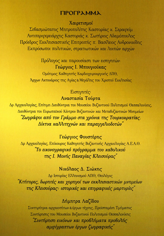 Αξιόλογοι επιστήμονες και ερευνητές θα αναπτύξουν ενδιαφέροντα θέματα και θα παρουσιάσουν τις μοναδικές πτυχές της θρησκευτικής τέχνης της Κλεισούρας και της ευρύτερης περιοχής μας.