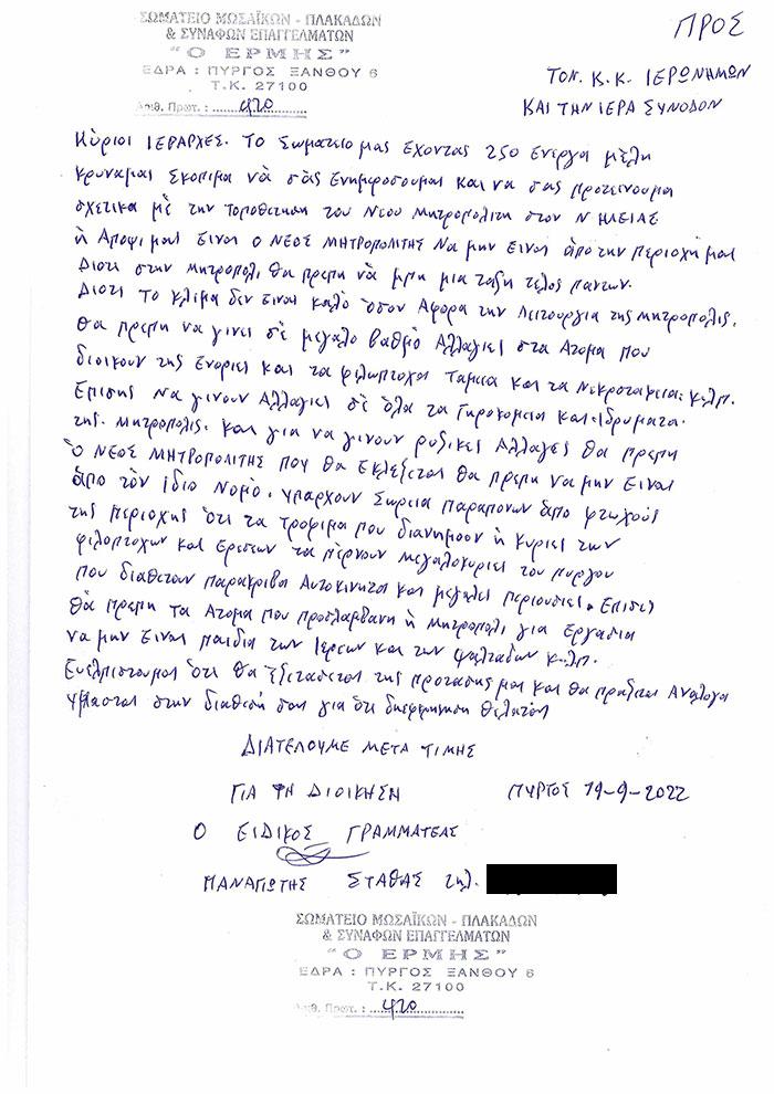 Με μια μεστή νοημάτων επιστολή προς τον Αρχιεπίσκοπο Αθηνών και Πάσης Ελλάδος κ. Ιερώνυμο και τους Ιεράρχες της Ιεράς Συνόδου που θα κληθούν εντός Οκτωβρίου να εκλέξουν μεταξύ άλλων και τον νέο Μητροπολίτη Ηλείας, το Σωματείο Επαγγελματιών τονίζει – εμμέσως πλην σαφώς- την αντίθεσή του να εκλεγεί στη θέση αυτή ο εκλεκτός του πρώην Ηλείας κ. Γερμανού Θεοφιλέστατος Επίσκοπος Ωλένης κ. Αθανάσιος.