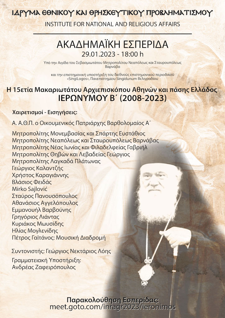 Το «Ίδρυμα Εθνικού και Θρησκευτικού Προβληματισμού (Ι.Ε.Θ.Π.)» διοργανώνει διαδικτυακή Ακαδημαϊκή Εσπερίδα για την 15ετία του Αρχιεπισκόπου Αθηνών και πάσης Ελλάδος Ιερωνύμου Β΄, η οποία θα πραγματοποιηθεί την Κυριακή, 29 Ιανουαρίου 2023.