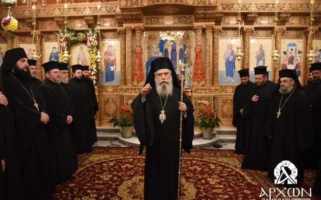 Ο Σεβ. Μητροπολίτης μας, αφού συνεχάρη τον Ιεροκήρυκα π. Ιουστίνο για την διακονία του θείου κηρύγματος, ομίλησε στους πιστούς για την θυσιαστική αγάπη του εορτάζοντος Αγίου για τον Χριστό. “Ο Χριστός ζητά την θυσία μας για να μας κάνει αιώνιους”, τόνισε χαρακτηριστικά. Συνάμα, ανέφερε ότι εμείς οι Χριστιανοί πρέπει να είμαστε οπλισμένοι με πίστη Χριστού για να αντιμετωπίσουμε τις δύσκολες μέρες που έρχονται. Τέλος, δεν παρέλειψε να επαινέσει τους ενορίτες, αλλά και όσους συνετέλεσαν στην εκ βάθρων ανακαίνιση του ενοριακού Ιερού Ναού.