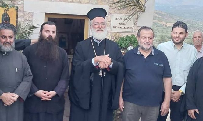 Την Κυριακή 21 Ιουλίου το απόγευμα, ο Σεβ. Μητροπολίτης μας κ. Ανδρέας χοροστάτησε στον πανηγυρικό Εσπερινό επί τη μνήμη της Αγίας Ισαποστόλου Μαρίας Μαγδαληνής της Μυροφόρου, στον ομώνυμο πανηγυρίζοντα Ιερό Ναό στη Χανδρού Αρκαλοχωρίου και ομίλησε καταλλήλως στο πολυπληθές εκκλησίασμα. Αξίζει να αναφερθεί ότι κτήτορας του Ιερού Ναού της Αγίας Μαρίας της Μαγδαληνής είναι ο κ. Νικόλαος Μαθιουδάκης, εθελοντής φωτογράφος και βιντεολήπτης της Ιεράς Μητροπόλεώς μας. Τέλος, τελέστηκε τρισάγιο στον μακαριστό Πρωτοπρεσβύτερο Αλέξανδρο Παναγιωτάκη, εφημέριο των Αγιών Παρασκιών, ο οποίος εκοιμήθη σήμερα. Μεταξύ άλλων παρέστησαν ο Δήμαρχος Μινώα Πεδιάδος κ.Βασίλης Κεγκέρογλου και ο Πυρηνικός Ιατρός Αν. Καθηγητής του ΙΤΕ κ. Γιώργος Παπαδάκης.