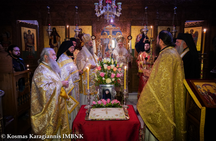 Στο Αρχιερατικό Συλλείτουργο που προηγήθηκε προεξήρχε ο Σεβασμιώτατος Μητροπολίτης Κίτρους, Κατερίνης και Πλαταμώνος κ. Γεώργιος, ο οποίος συνδεόταν με τη μακαριστή Γερόντισσα από την εποχή που υπηρετούσε ως Πρωτοσύγκελλος της Ιεράς Μητροπόλεως Βεροίας και συμμετείχε ο Ποιμενάρχης μας, Σεβασμιώτατος Μητροπολίτης Βεροίας, Ναούσης και Καμπανίας κ. Παντελεήμων, ο οποίος κήρυξε και τον θείο λόγο.