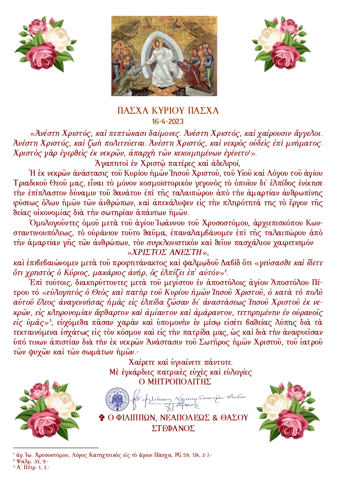 Ακολουθεί η Ποιμαντορική Εγκύκλιος για το Πάσχα 2023, του Μητροπολίτου Φιλίππων κ. Στεφάνου: