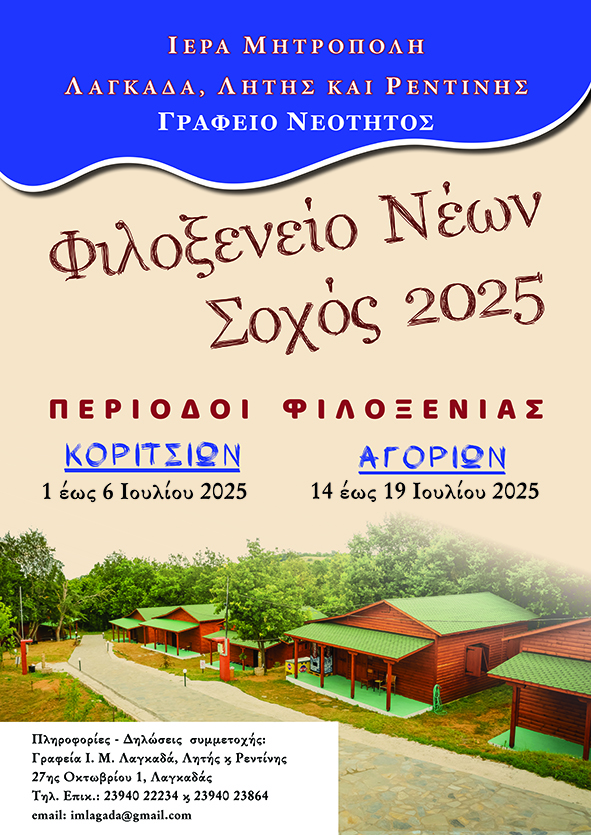 Τὸ Φιλοξενεῖον Νέων της Ἱερᾶς Μητροπόλεως Λαγκαδᾶ, Λητῆς καὶ Ρεντίνης, τό ὁποῖον θά λειτουργήσει κατά μήνα ΙΟΥΛΙΟΝ εἰς τήν περιοχήν τοῦ ΣΟΧΟΥ, ἀποτελεῖ, ἐδῶ καὶ χρόνια, ἕναν σημαντικὸν τομέα δράσεως καὶ προσφορᾶς τοῦ ποιμαντικοῦ ἔργου τῆς Ἱερᾶς ἡμῶν Μητροπόλεως, ποὺ ἀποβλέπει εἰς τὴν ψυχικήν, πνευματικήν, ἀλλὰ καὶ σωματικὴν ἀνάπτυξιν τῶν παιδιῶν σας.