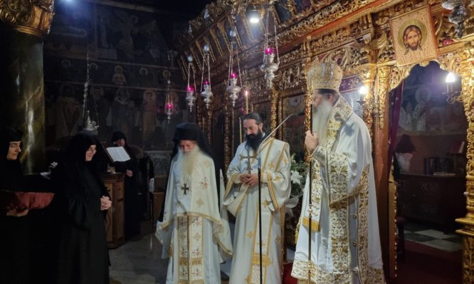 Τέλος, ο κ. Συμεών, κατόπιν κανονικής αδείας και ευλογίας του ΣεβασμιωτάτουΜητροπολίτουΣισανίου και Σιατίστης κ. Αθανασίου, τέλεσε χθες βράδυ Ιερά Αρχιερατική Αγρυπνία στην Ιερά Μονή Κοιμήσεως Θεοτόκου Μικροκάστρου επί τη επετείω των εις διάκονον (29 Οκτωβρίου) και εις πρεσβύτερον (30 Οκτωβρίου) χειροτονιών του, ενώ ιδιαίτερα μνημόνευσε τους μακαριστούς μητροπολίτες Καστορίας κυρούς Γρηγόριο τον Γ΄ και Σεραφείμ και τους μακαριστούς μητροπολίτες Σισανίου και Σιατίστης κυρούς Αντώνιο και Παύλο, μετά των οποίων απάντων είχε ιδιαίτερο σύνδεσμο. Στην προσλαλιά του ο κ. Συμεών απευθυνόμενος στην εμβληματική γερόντισσα της Μονής, Καθηγουμένη Θεολογία, και τις αδελφές του πολυπληθούς κοινοβίου αναφέρθηκε στο θέμα: «Δεν υπάρχει αγάπη έξω από την Θεία Ευχαριστία». Ο κ. Συμεών τόνισε ότι «η αγάπη βρίσκει την τελείωση και την ολοκλήρωσή της μέσα στην Θεία Ευχαριστία και στα μυστήρια της Εκκλησίας και ότι έξω από αυτήν την μυστηριακή ζωή, η οποιαδήποτε μορφής αγάπη είναι κολοβή και ατελής». Ο κ. Συμεών εξέφρασε την ευγνωμοσύνη του για την 30χρονη προσφορά της αδελφότητας της Ιεράς Μονής του Μικροκάστρου, υπό την σεβαστή γερόντισσα Θεολογία, σε ολόκληρη την Δυτική Μακεδονία και γενικότερα στον ορθόδοξο κόσμο.