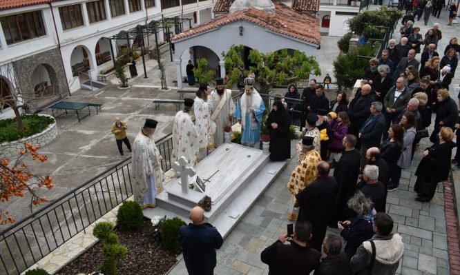 Τέλος, μετά την αποκάλυψη της αναθηματικής πλάκας των Εγκαινίων, ο κ. Συμεών τέλεσε Αρχιερατικό Τρισάγιο επί του τάφου του μακαριστού Οσίου Γέροντος π. Αμβροσίου Λάζαρη του Πνευματικού, ο οποίος αναπαύεται στην αυλή του Μοναστηριού.