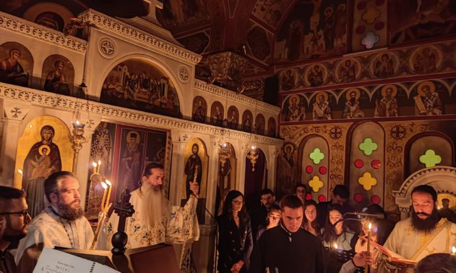 Σε κλίμα κατάνυξης και μέσα στην ησυχία της νύχτας, οι μαθητές και οι μαθήτριες του Ωδείου, υπό τον Διευθυντή Δρ. κ. Ανδρέα Ιωακείμ και τους καθηγητές, μετέτρεψαν όλο το Ναό του Αγίου Εφραίμ σε έναν τεράστιο Βυζαντινό Χορό και οι μελωδίες βγαλμένες μέσα από τις αγγελικές φωνές των παιδιών, μα πάνω απ’ όλα βγαλμένες μέσα από την καθαρή τους καρδιά, ταξίδεψαν μέχρι τον Θρόνο του Θεού, συνταξιδεύοντας πνευματικά μαζί τους και όλους τους πιστούς που παραβρέθηκαν στην Ιερά Αγρυπνία, αλλά και τους αναρίθμητους ακροατές του Ραδιοφωνικού Σταθμού της Μητροπόλεως (89,4 Fm), οι οποίοι τόσο μέσω των ερτζιανών, όσο και μέσω του διαδικτύου έγιναν κοινωνοί και συνταξιδευτές της προσευχής και της κατάνυξης.