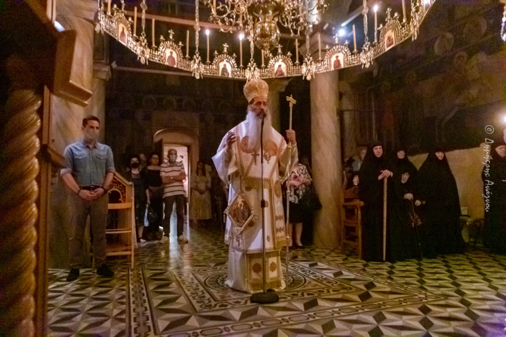 Ακολούθως ο κ. Συμεών μετέβη στην Ιερά Μονή Παναγίας Δαμάστας, όπου τον υποδέχθηκε η Καθηγουμένη της Μονής Γερόντισσα Ιωάννα και σύσσωμη η αδελφότητα, και ετέλεσε την Αναστάσιμη Αρχιερατική Θεία Λειτουργία και Αγρυπνία για την Απόδοση της Εορτής του Πάσχα.