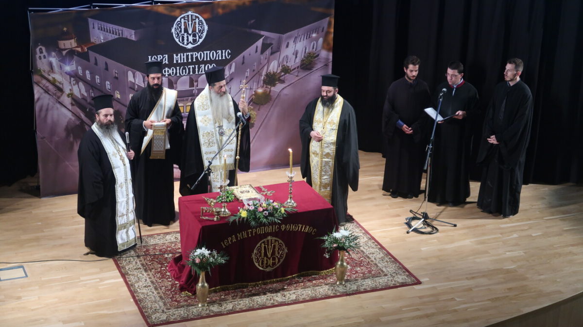 Ο κ. Συμεών πλαισιούμενος από τον Διευθυντή του Γραφείου Νεότητος, Πρωτ. π. Κωνσταντίνο Βάγια και τον Αναπληρωτή Διευθυντή, Πρωτ. π. Χρήστο Τσιλοφύτη τέλεσε αρχικά την ακολουθία του Αγιασμού, παρουσία στελεχών του Γραφείου Νεότητος, κατηχητών και κατηχητριών των Ενοριών, καθώς και των ιερέων νεότητας της Μητροπόλεως, του Διευθυντή Β/θμιας Εκπαιδεύσεως Φθιώτιδος κ. Κωνσταντίνου Σπαλιώρα, εκπροσώπου του Διευθυντού Α/θμιας Εκπαιδεύσεως και εκπροσώπων Συλλόγων Γονέων και Κηδεμόνων Σχολικών Μονάδων της Φθιώτιδος.